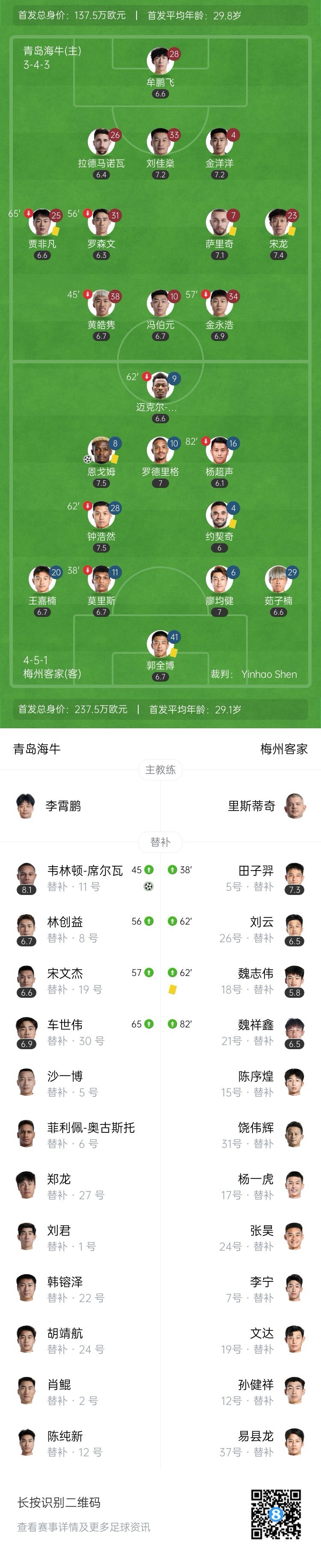 全場(chǎng)比賽結束,青島海牛1-1戰平梅州客家。